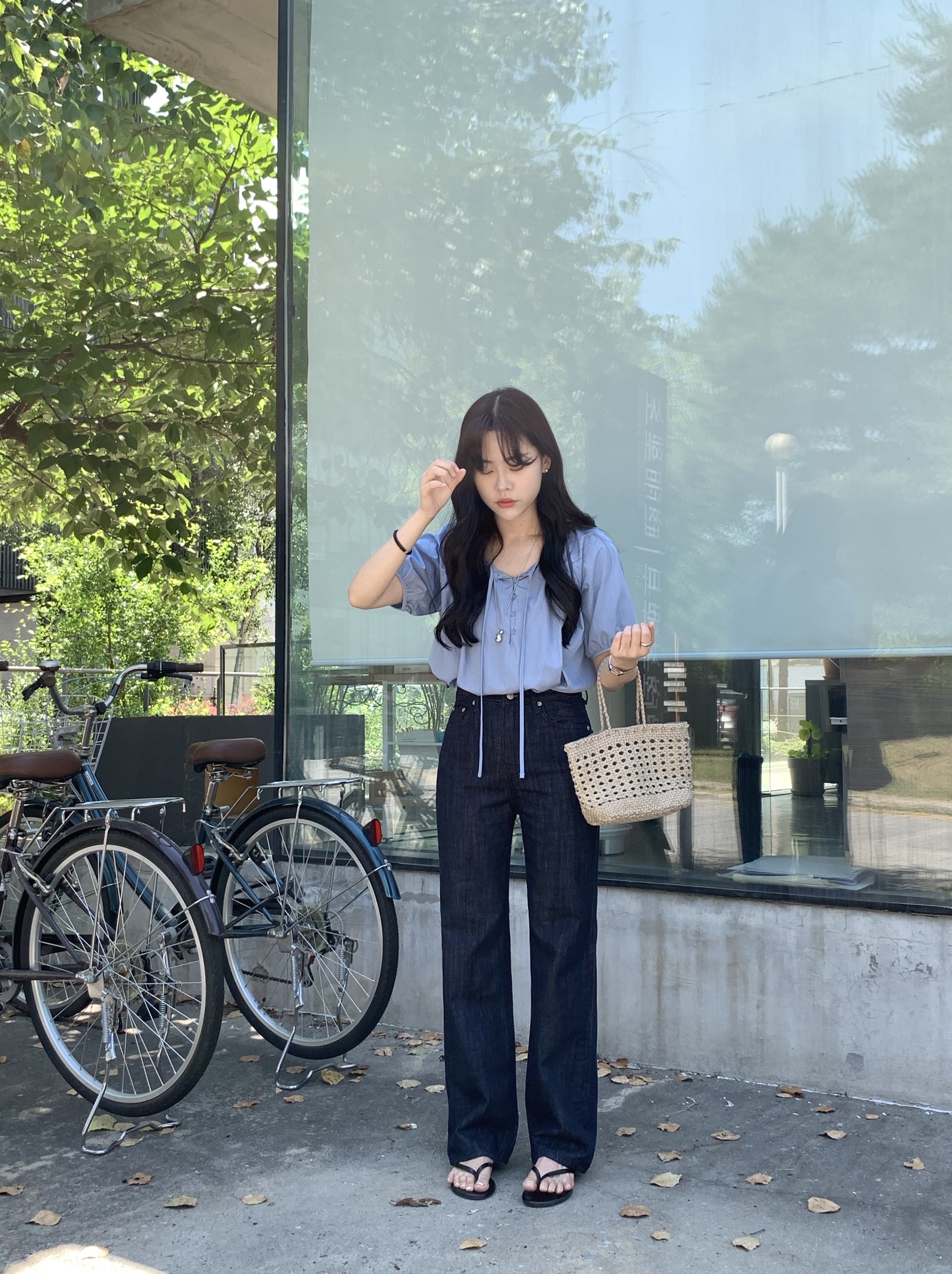 TOP - RIBBON BUTTON SHIRRING BLOUSE (SKYBLUE)