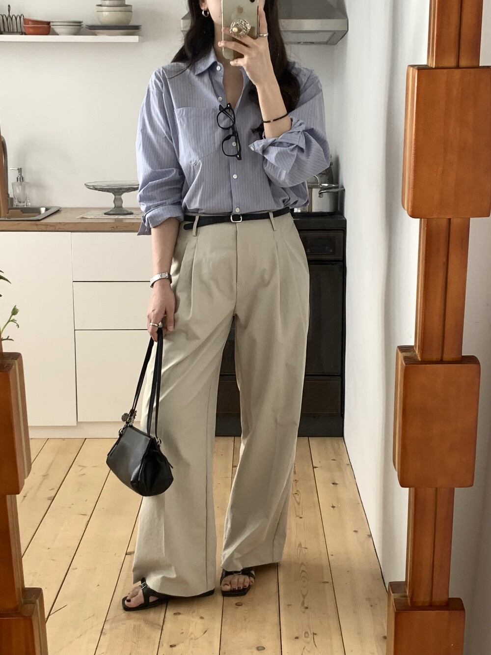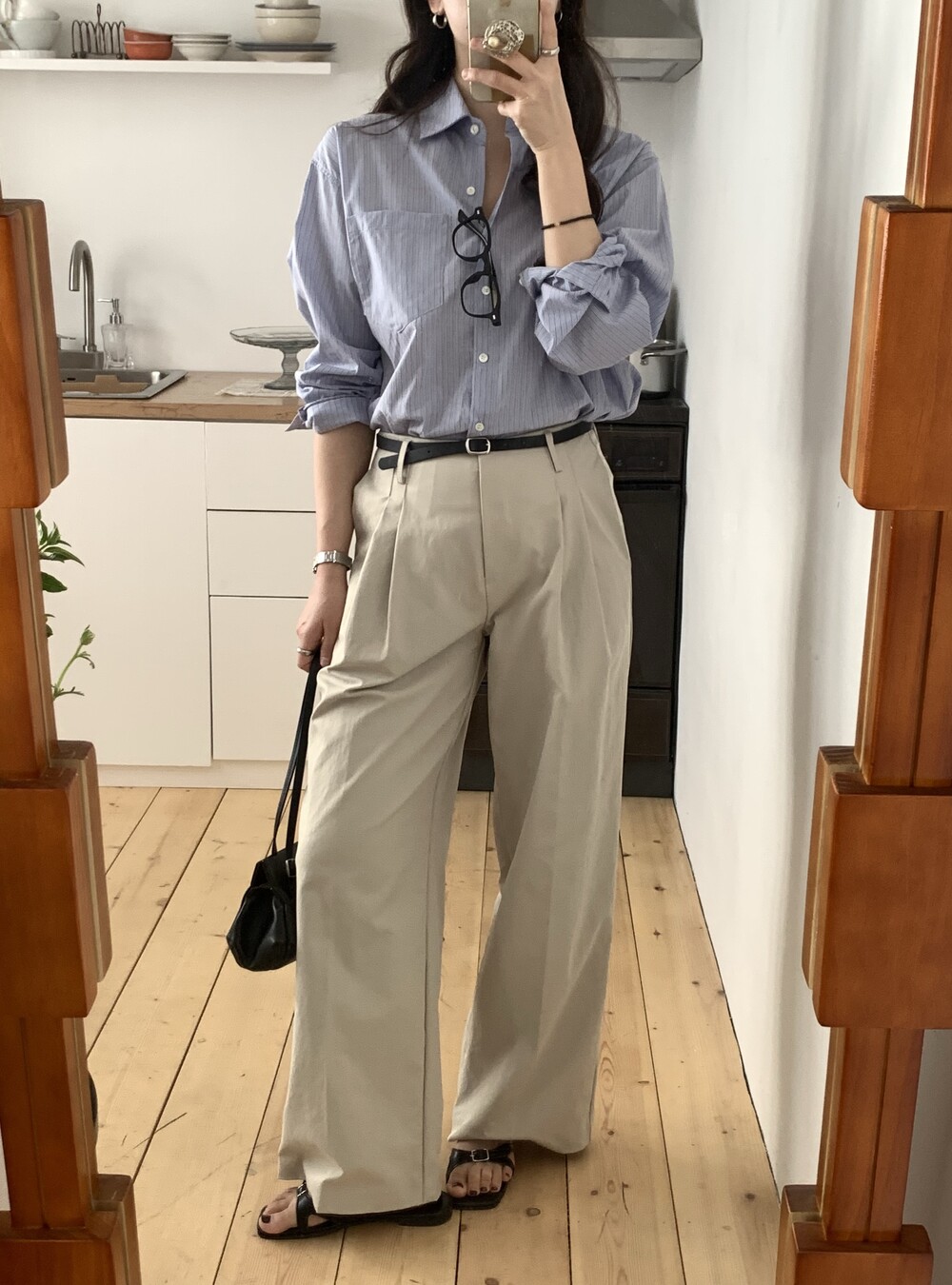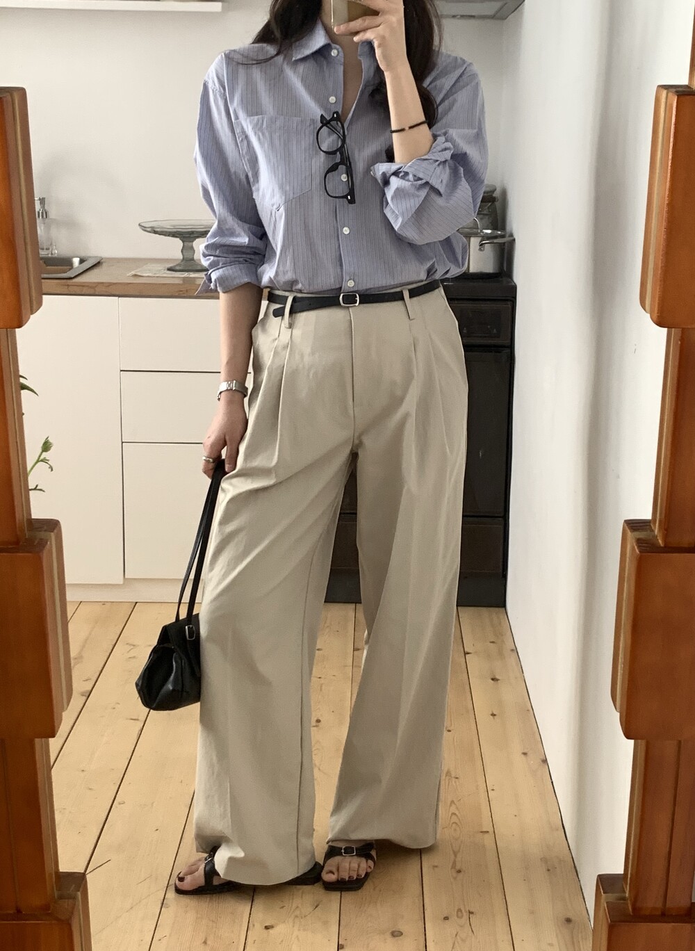 BOTTOM - HERRINGBONE COTTON SEMI-WIDE PANTS (IVORY/S)