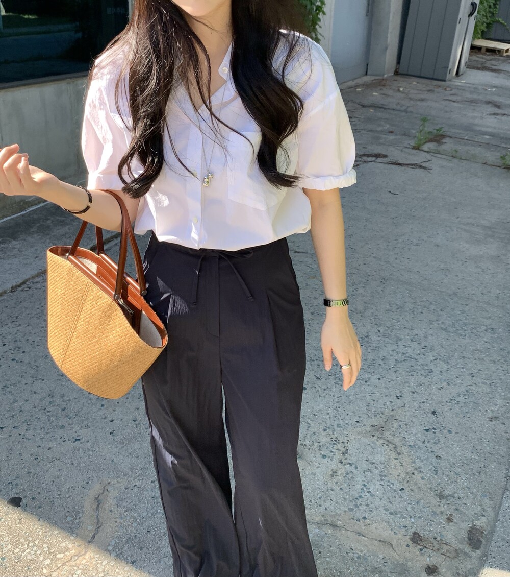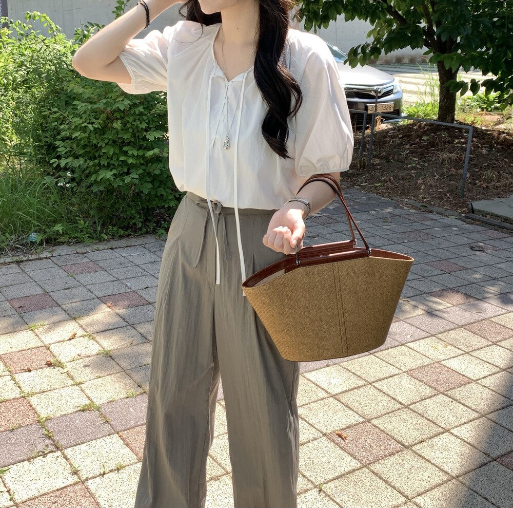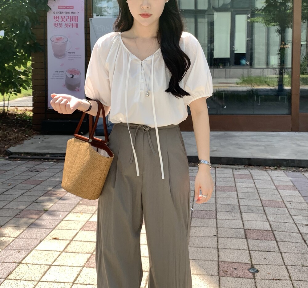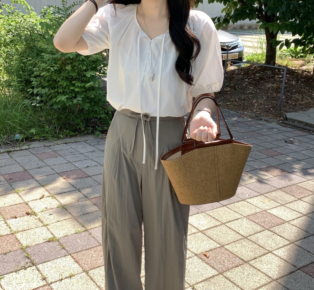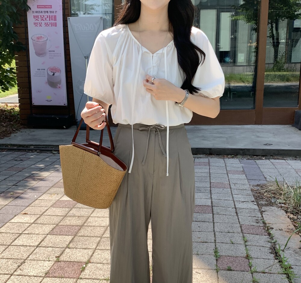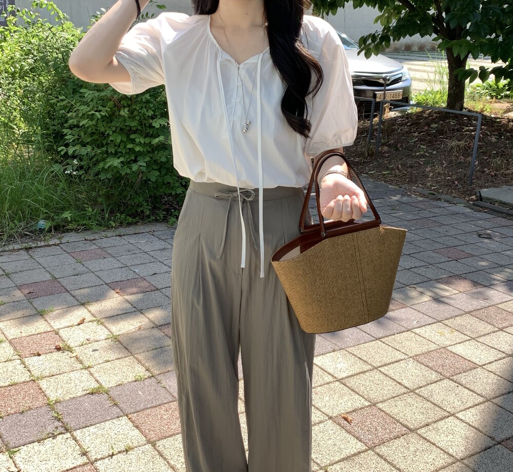 TOP - RIBBON BUTTON SHIRRING BLOUSE(IVORY)